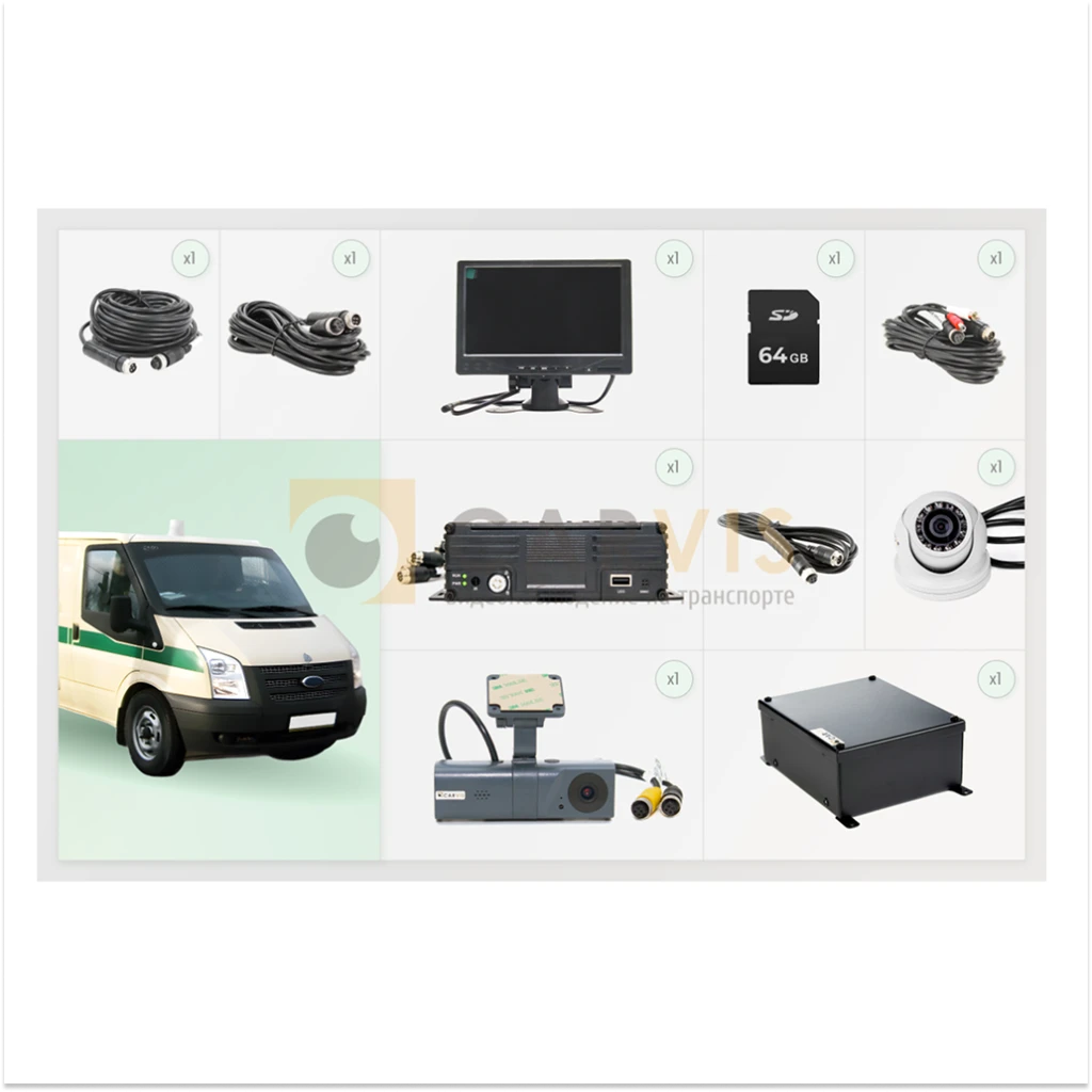 Предложенный комплект представляет собой стандартное решение для автомобиля службы инкассации. В зависимости от конкретных потребностей вашей организации и особенностей транспортных средств, можно создать индивидуальный комплект видеонаблюдения.